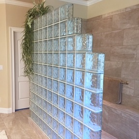A glass block wall combines privacy with natural light, creating bright yet secure interiors. It adds a modern, textured aesthetic while improving insulation and sound resistance.